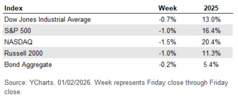 Overall, the U.S. equity markets finished the year on a solid note. The tech-heavy Nasdaq closed out 2025 up +20.4%, the broad benchmark S&P 500 advanced +16.4%, and the blue-chip Dow Jones climbed +13.0%.