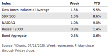 Outlook The University of Michigan's Consumer Sentiment Index is perhaps the most widely known indicator of how the typical U.S. consumer feels about their economic situation on a monthly basis. Since its inception in the 1950's, two of the lowest three readings came in the last few years (2022 and April of this year). While this sounds like bad news on the surface, historically low readings have many times been followed by rising confidence alongside economic expansion.1 Since the recent low in April, the Index has risen sharply but is still well below its long-term average. The economy does indeed appear to be doing well, as wages are growing faster than inflation (wage growth) and declining credit card delinquencies (normal range). However, this week will prove to be very informative as we will get the official 2nd quarter GDP estimate on Friday, updates on inflation, jobs, consumer confidence, and the Fed's interest rate decision. Additionally, earnings will be reported by several major tech giants (Microsoft, Meta, Apple, Amazon). . . . U.S. equity markets posted strong gains in the prior week, driven by robust corporate earnings and evolving trade dynamics. The S&P 500 closed at another high, above 6,300 for the first time, marking the 12th record close of 2025. The Nasdaq Composite surged above 21,000, boosted by strength in the technology sector and optimism surrounding artificial intelligence. Meanwhile, the Dow Jones Industrial Average reached 45,010 intra-week, just shy of a new all-time high. Taken together, these moves reflect a continuation of the recent trend of low volatility and steady, upward momentum across major indices. Tariffs and trade developments have been a key source of uncertainty this year, but are gradually showing signs of resolving as more trade deals are being announced before the August 1st deadline. For instance, U.S. President Donald Trump revealed a “massive deal” with Japan on Tuesday. The deal includes a $550 billion investment commitment in the U.S., and a reduction in the proposed tariffs on Japanese imports from 25% to 15%.2 Additionally, Trump continued negotiations with the European Union over the weekend, which resulted in another trade deal. The agreement established a 15% baseline tariff on EU exports to the U.S.3 These agreements will likely serve as templates for other major countries as negotiations continue. While trade deals with the EU, U.K., Vietnam, Indonesia, Japan, and partially with China are solidified, discussions with Canada, South Korea, and India remain in progress. Collectively, these developments suggest that the worst-case scenarios are being avoided, and the growing clarity is helping to restore investor confidence and support increased investment spending. On the monetary policy front, the White House has been ramping up pressure on the Federal Reserve to adopt a more accommodative stance (to lower interest rates), referring to other central banks that have taken more aggressive rate-cutting actions. Notably, the European Central Bank has reduced its benchmark rate by 2.0% over the past year, compared to the Federal Reserve’s 1.0% reduction. Despite this political pressure, the Federal Reserve is widely expected to maintain its current policy stance at the upcoming meeting on Wednesday. The decision to maintain thus far has been underpinned by the continued strength of the U.S. economy, along with lingering concerns about potential inflationary pressures. Looking ahead, the possibility of a rate cut in September remains on the table. Market participants are currently pricing in a 60-61% chance of a 25 basis point reduction in September, with expectations for two total rate cuts (50 basis points) by year-end. The Fed’s path forward will likely depend on incoming economic data and the outcome of ongoing trade-related negotiations. |