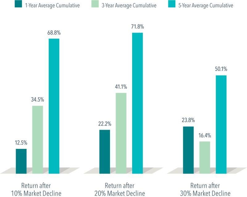 On average, just one year after a market decline of 10%, stocks rebounded 12.5%. One year after 20% and 30% declines, the cumulative returns topped 20%. Five years after market declines of 10%, 20%, and 30%, the average cumulative returns all top 50%.