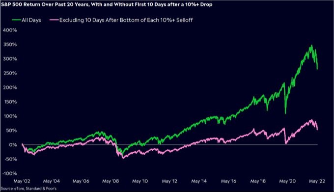 If you invested in a hypothetical S&P500 fund 20 years ago and missed the first 10 days of each market rebound, you would've forfeited more than half your gains vs. just holding. This is why staying invested during down and volatile markets is important.