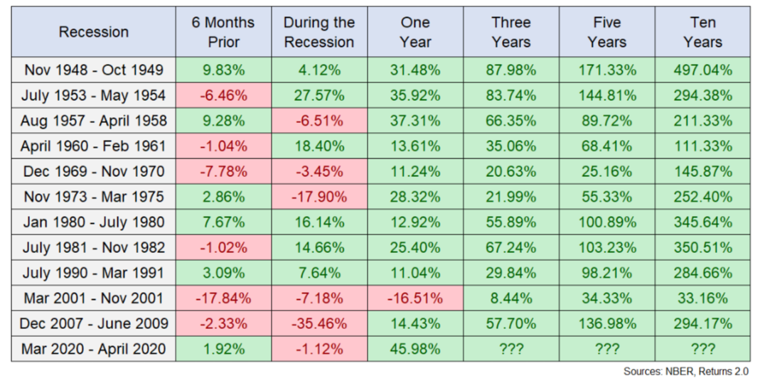 Five years after a recession: All positive returns with many triple digit returns.
