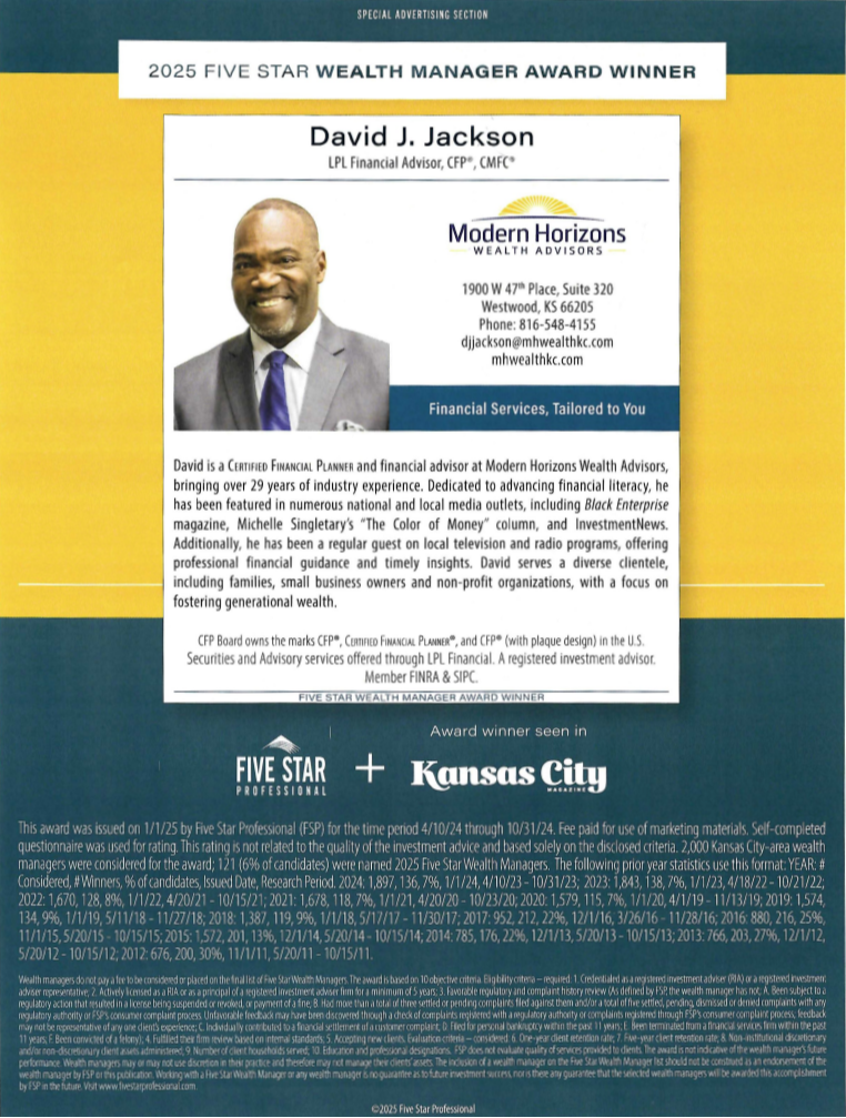 David has been featured in national and local media outlets seeking his financial expertise. He has been quoted in articles for Black Enterprise Magazine and Michelle Singletary’s Color of Money Column and InvestmentNews, a financial trade publication. David is a regular guest on NPR’s local affiliate, KCUR’s Up To Date program representing The Financial Planning Association of Greater Kansas City. He has also been a regular guest on KCTV5’s Better Kansas City. He is a frequent contributor to the Kansas City Call newspaper, providing financial tips in the column “Financial Matters”. David specializes in retirement planning and working with small business owners. He is an active member for the Financial Planning Association of Greater Kansas City, the Business Advisory Board of the Kansas City Kansas Community College and a member of the Urban Financial Services Coalition.